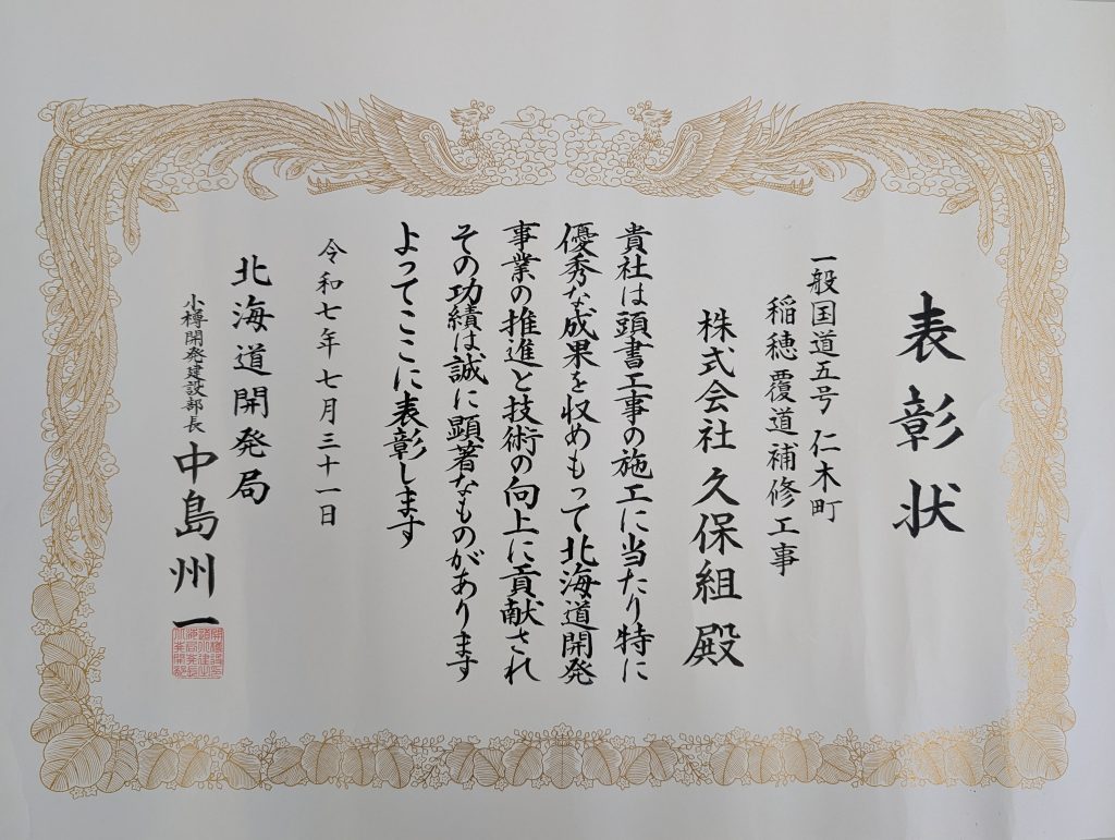 「一般国道5号 仁木町 稲穂覆道補修工事」が北海道開発事業の推進と技術の向上に貢献したとして、北海道開発局小樽開発建設部長より表彰状をいただきました。