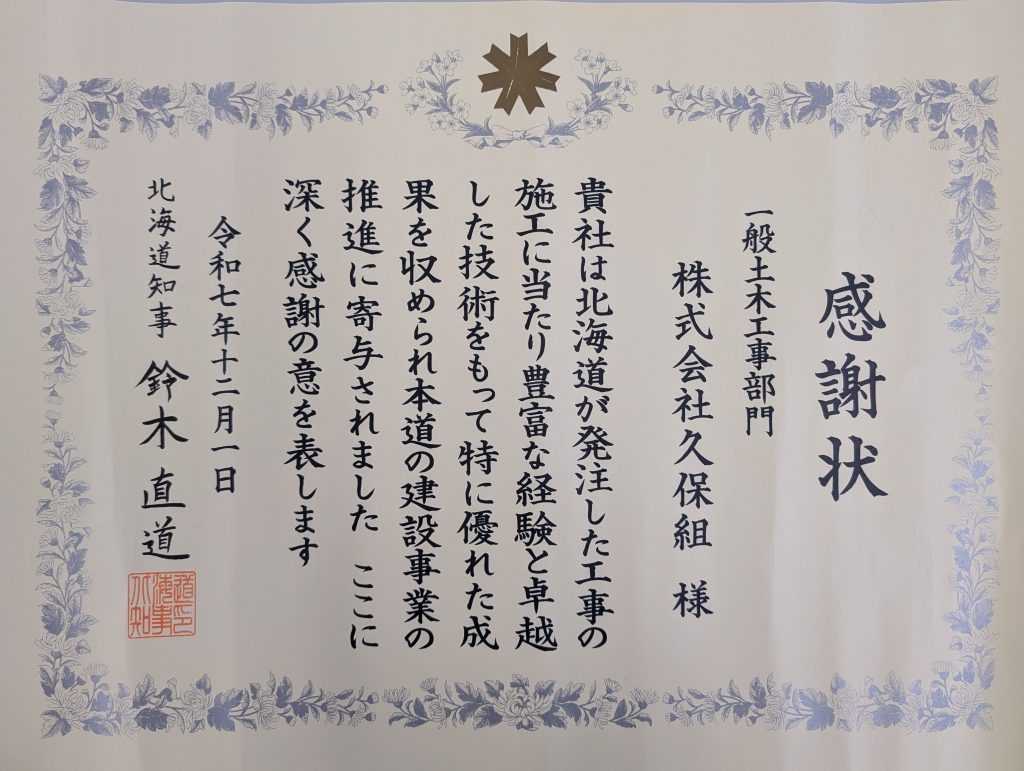 また、北海道建設部一般土木工事部門において、建設事業の推進に寄与されたとして北海道知事より感謝状をいただきました。